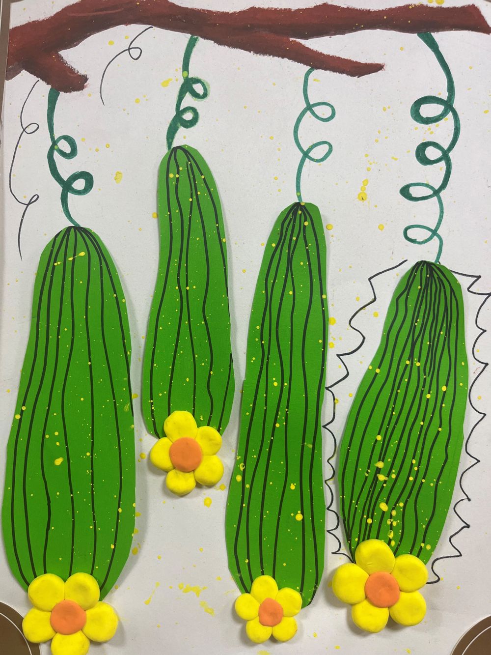 色彩鲜明,对比强烈:画作中的绿色丝瓜与黄色花朵形成了鲜明的色彩对比,既突出了主题,又使得整个画面生动活泼。这种色彩的运用,很好地捕捉了儿童画作的鲜明特色,展现了孩子们对色彩的敏锐感知和大胆运用。