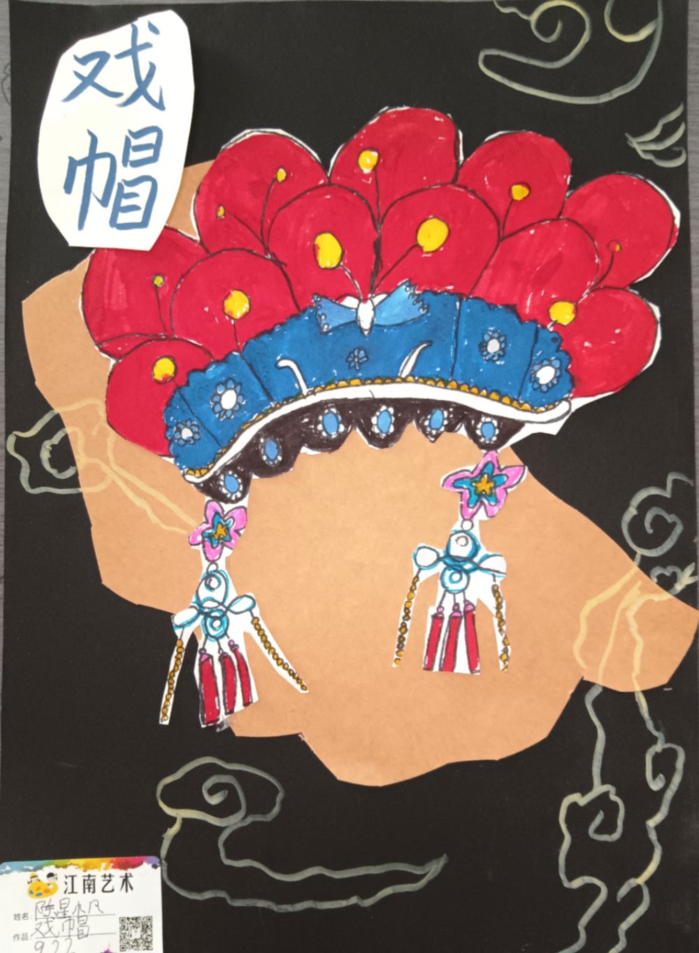 色彩与构图:黑色的背景与鲜艳的头饰形成了鲜明的对比,使得头饰成为画面的视觉焦点。同时,背景上的白色云朵状图案又打破了黑色的单调,为画面增添了一抹轻盈和梦幻感。整个构图简洁而不失丰富,既突出了主题又保持了画面的平衡。