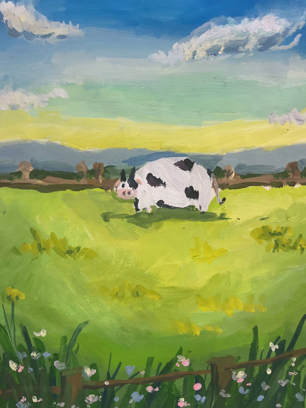 - 细节描绘:画家对奶牛的描绘非常细致,无论是它黑白相间的毛发、专注吃草的神态,还是那悠闲自得的姿态,都展现了画家对生活的细致观察和深刻感悟。同时,草地上的野花、远处的树木以及天空中的白云等细节描绘,也为画面增添了更多的生活气息和趣味性。