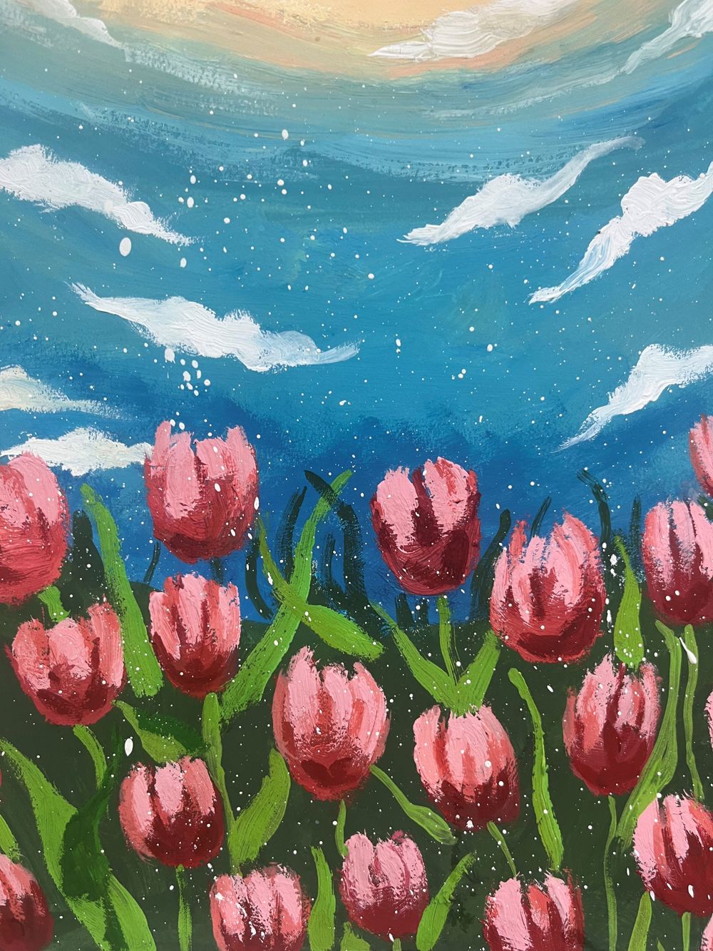 综上所述,这幅描绘郁金香花田的画作是一幅充满艺术魅力和情感感染力的佳作。它以独特的色彩和细腻的描绘手法,展现了自然之美与生命之力的完美融合,让人在欣赏中感受到一种宁静而又充满活力的美好境界。
