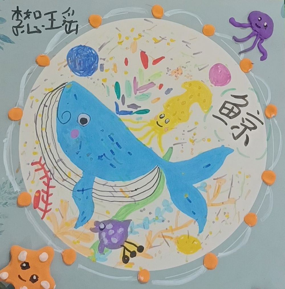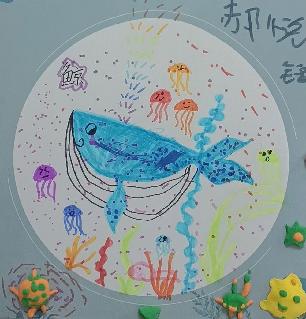 再者,画作的细节处理也非常值得称赞。比如鲸鱼的身体轮廓被描绘得既流畅又富有动感,似乎正在海洋中自由翱翔;而周围的海底生物也各有特色,形态各异,展现了孩子丰富的想象力和创造力。此外,右上角的“鲸鱼”二字可能是孩子的名字或是对作品的自我标识,也体现了孩子对自己作品的珍视和认同。