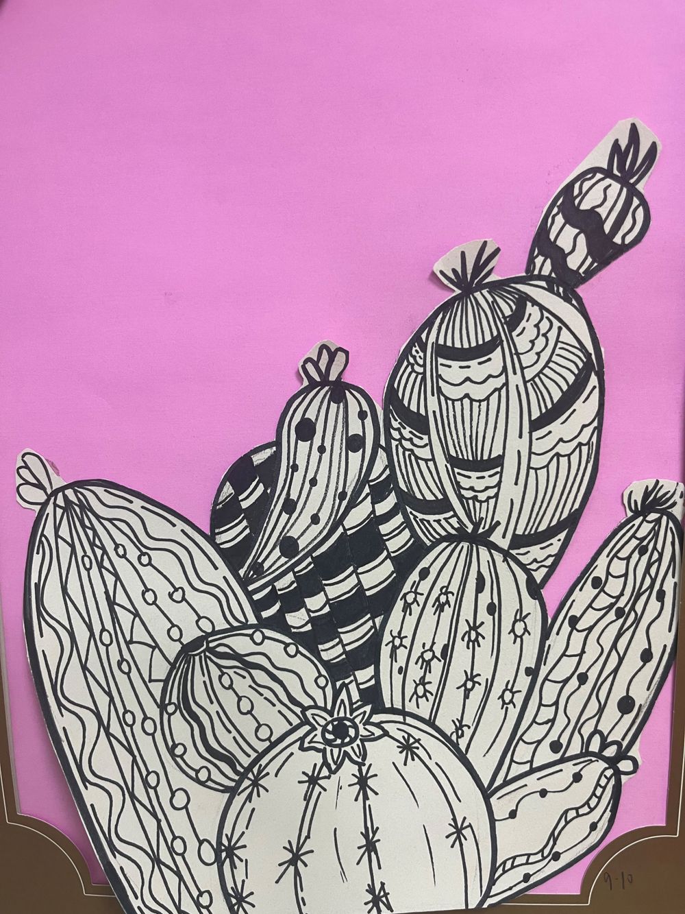 在色彩运用上,虽然画面以黑白线条为主,但背景却巧妙地选用了粉红色,这种色彩的选择既与多肉植物的绿色形成了鲜明的对比,增强了画面的视觉冲击力,又赋予了画面一种温馨、柔和的氛围。粉红色背景的融入,使得整个画面在简洁中又不失柔美与温情。