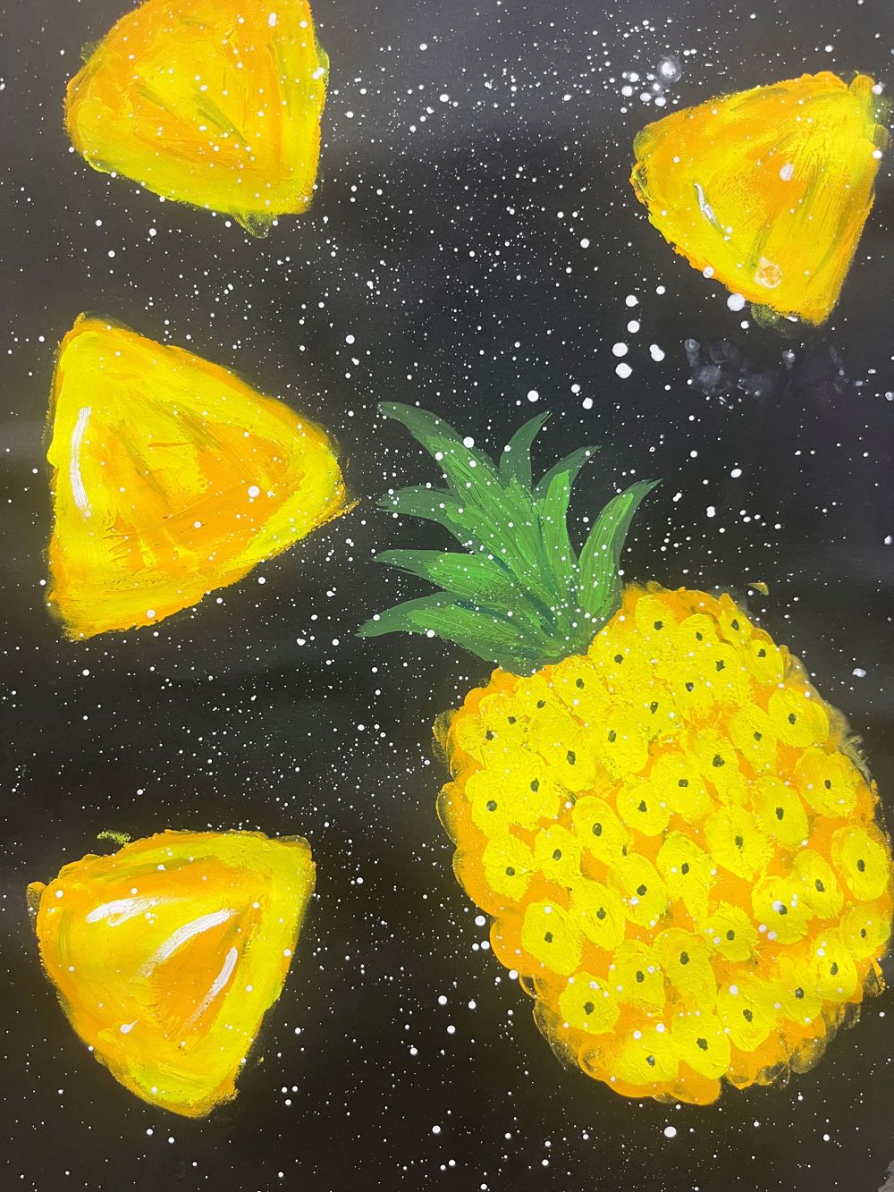 这幅描绘菠萝的画作,以其独特的构图、鲜明的色彩对比以及富有创意的背景设计,给人留下了深刻的印象。以下是对这幅画的详细点评:
