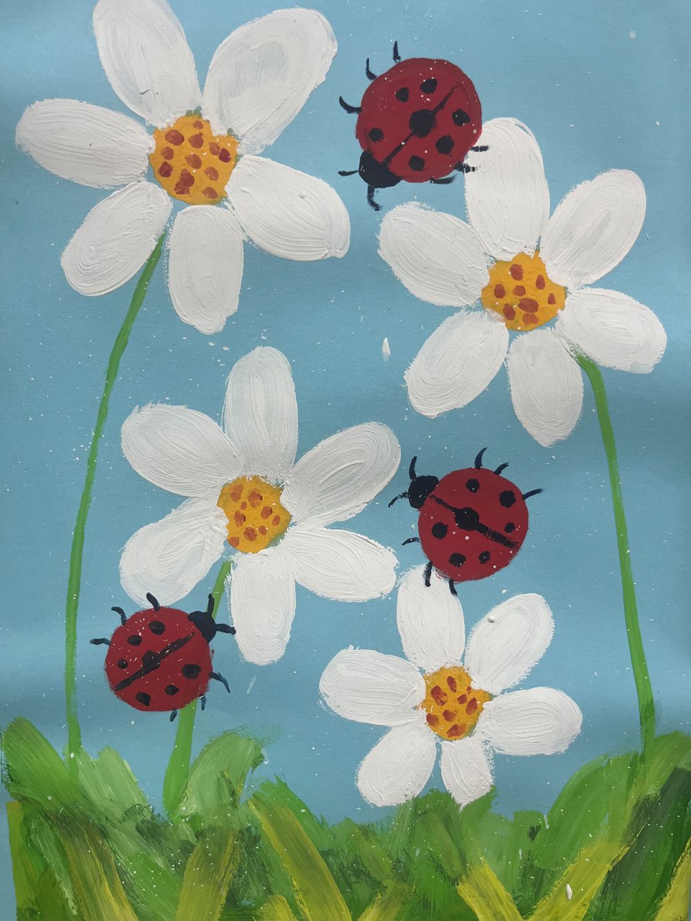 接着,三只红色带黑色斑点的瓢虫成为了这幅画的点睛之笔。它们的颜色与背景形成了鲜明的对比,红色与绿色的草地、蓝色的天空相互映衬,使得画面更加生动活泼。瓢虫们的形态各异,有的在悠闲地爬行,有的在静静地停歇,这种动态的平衡让整个画面充满了生命力。