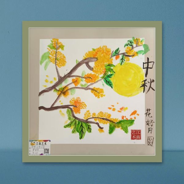 画作的主题“中秋花好月圆”直接点明了其寓意——中秋佳节,花好月圆,人团圆。这不仅是对中秋节这一传统节日的美好祝愿,也是对幸福、和谐生活的向往。画中的花朵象征着生活的美好与希望,而“太阳”或“月亮”则寓意着团圆与光明。