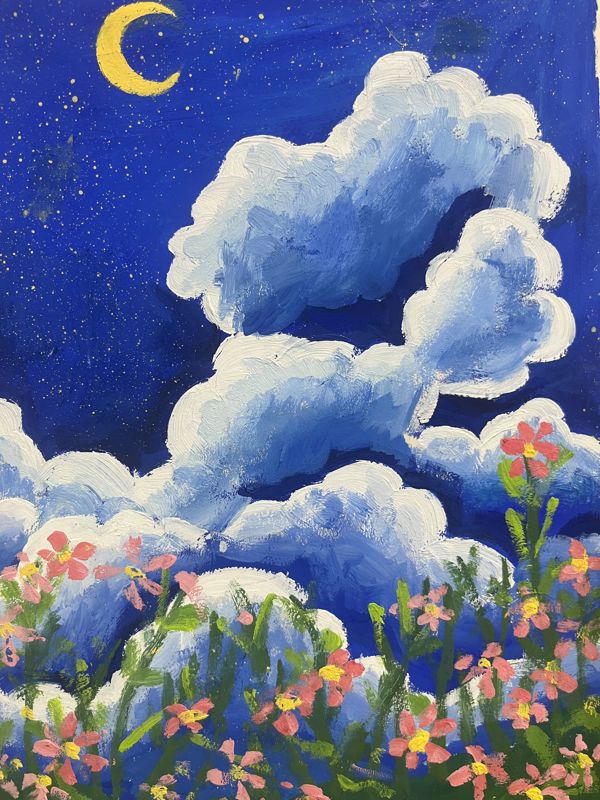 色彩运用:画面中的色彩搭配既大胆又和谐。蓝色作为背景色,不仅符合夜空的特征,还营造出一种深邃而宁静的视觉效果。云朵的洁白与大树上的粉红花朵、黄色小花形成了鲜明的对比,既突出了画面的主体,又增添了生动与活力。金色的半月与闪烁的星星则为整幅画增添了一抹温馨与希望,使夜空不再单调乏味。