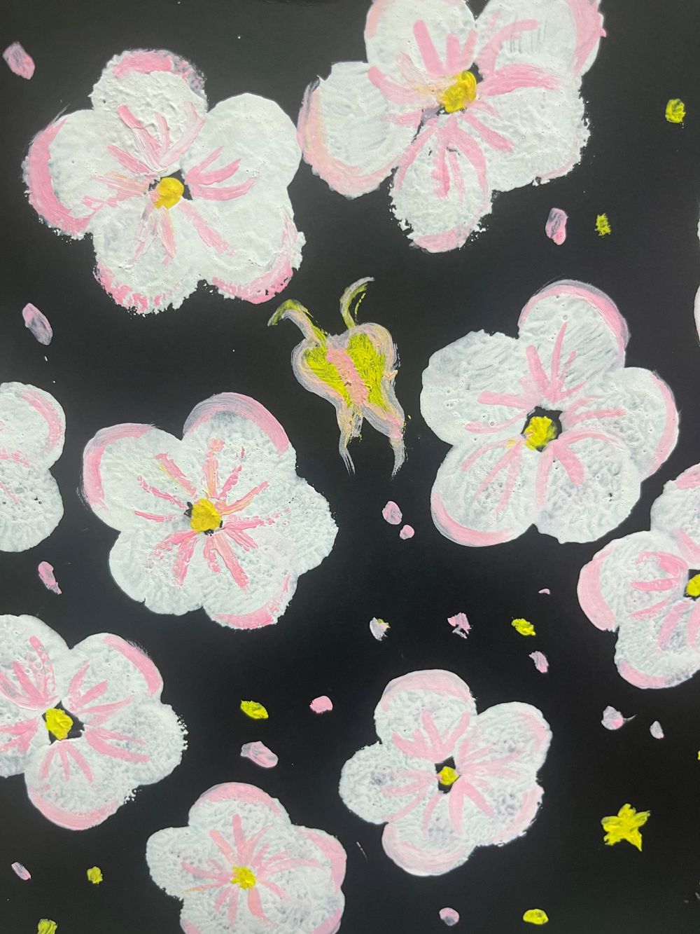 画面以黑色为基底,这种深邃的背景为前景的花朵提供了极佳的衬托,使得每一朵桃花都显得尤为醒目。粉红色和白色的花朵交织在一起,不仅丰富了画面的色彩层次,还营造出一种温馨而浪漫的氛围。特别是花瓣上的黄色点缀,如同晨曦中的露珠,为整幅画增添了一抹生动与活力。