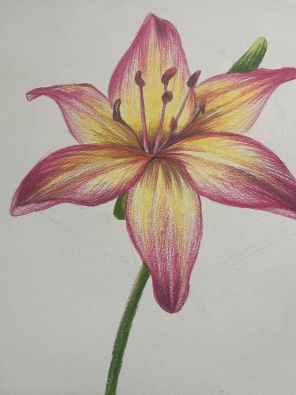 色彩运用:画家巧妙地运用了粉红色和黄色作为花朵的主色调,这两种颜色相互映衬,既展现了百合花的清新脱俗,又增添了几分温馨与浪漫。粉红色的花瓣如同少女的脸颊,而黄色的点缀则如同阳光洒落,为整幅画增添了生机与活力。深棕色的花蕊与周围细小的花丝形成了鲜明的对比,使得花蕊部分更加突出,展现了花朵的精致与细腻。