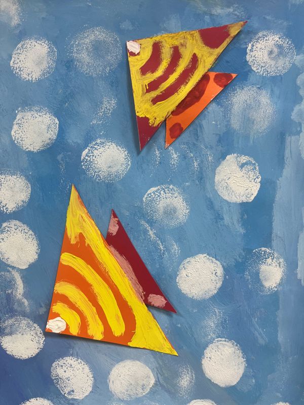 两个三角形图案的摆放方式极具动感,一个尖端朝左,一个尖端朝右,仿佛在相互追逐或嬉戏。这种布局不仅打破了画面的静态感,还巧妙地引导了观者的视线流动,让人感受到一种动态平衡之美。同时,背景中的白色圆点作为点缀元素,既丰富了画面的层次感,又增添了一丝神秘和梦幻的色彩。