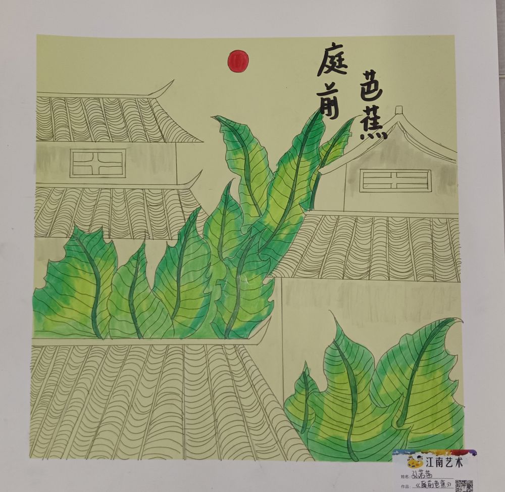 这幅手绘作品《庭前芭花》无疑是一幅充满东方韵味与诗意的佳作。画面以淡雅的色彩和细腻的笔触,构建了一个宁静而和谐的庭院景象,让人仿佛能穿越时空,感受到那份超脱世俗的宁静与美好。